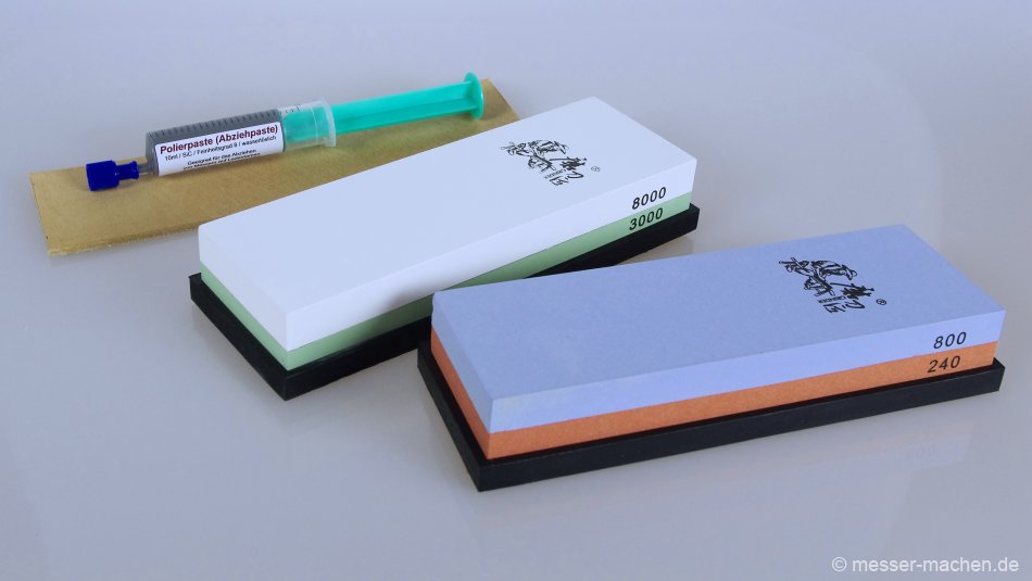 Den 240/800'er Stein nehme ich, um bei neuen Messern eine Grundschärfe anzuschleifen. Bei europäischen rostfreien Messern gehe ich nach der 800'er Seite direkt auf den Lederriemen mit Polierpaste. Bei japanischen rostfreien Messern, die oftmals ein etwas feinkörnigeres Stahlgefüge haben gehe ich nach dem 3000'er Stein auf den Lederriemen mit Polierpaste. Bei den rostenden Klingenstählen nutze ich nach der 8000'er Seite den Lederiemen zum Abziehen. Wer auch Rasiermesser schärfen will, sollte noch einen Chromoxidriemen hinzunehmen