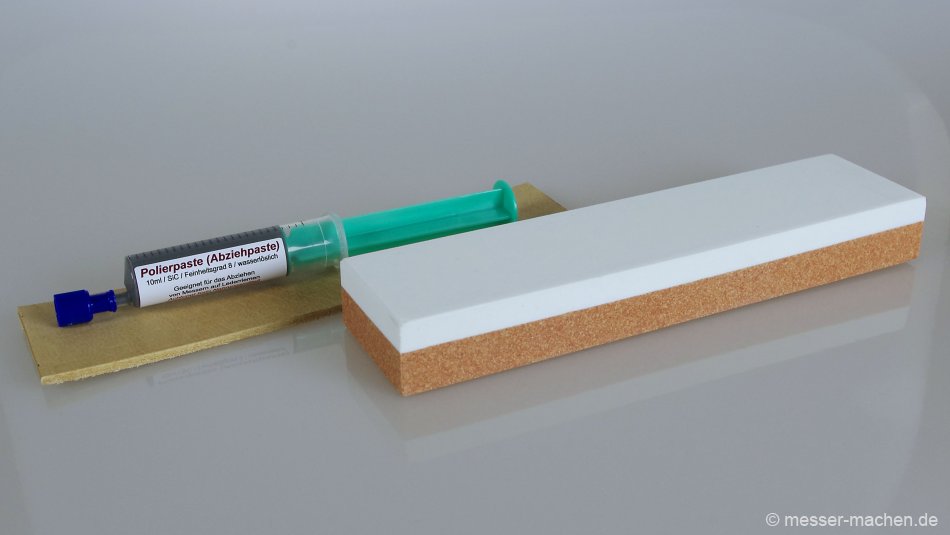 Starterschleifset mit vorbehandeltem Lederriemen, aber ohne Polierpastenspritze gibt es bei Scherenkauf oder bei Amazon. Das behandelte Leder reicht für das Abziehen von ca. 50 Messern. Der Vorteil ist, dass Ihr kein zusätzliches Lederöl zum Behandeln braucht.