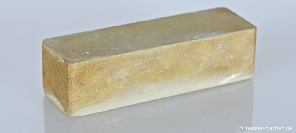 Nagura Dictum 1zu1Der synthetische Nagurastein fördert bei Schleifbeginn die Bildung von Schleifschlamm, welcher das Schliffbild satiniert. Dieser Matsunaga Nagurastein harmoniert gut als Anreiber mit feinen japanischen Wassersteinen. Daher ist er für Besitzer von feinen Wassersteinen ab 3000'er Körnung sinnvoll. Ich setze ihn gerne mit meinen 6000'er Wassersteinen ein, die ein wenig härter gebunden sind und von sich aus nicht schnell genug Schleifschlamm liefern, bzw. rutschige Stellen bekommen.